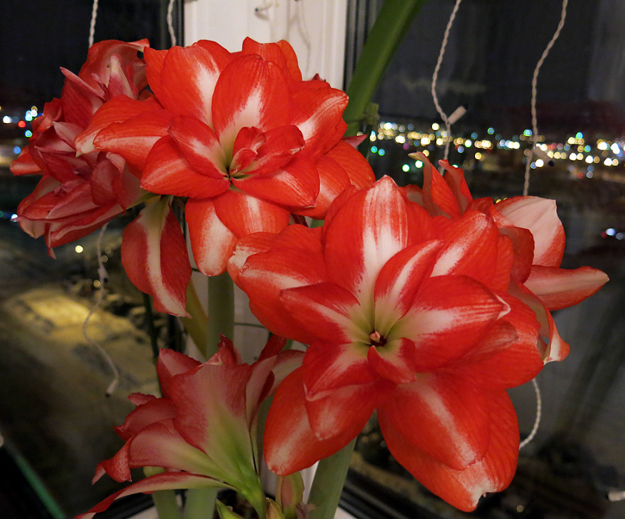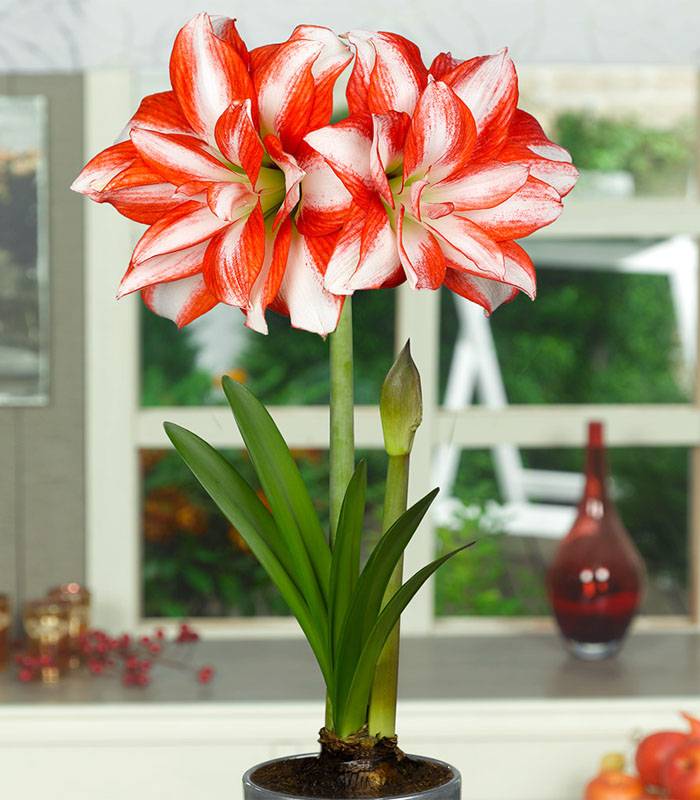 Луковицы Амариллиса гибридного Экзотик Пекок (Exotic Peacock) понравятся любителям буйства красок и яркой экстравагантности. Огромные махровые цветки сразу привлекают внимание. Удлиненные остроконечные лепестки белые, украшены широкими оранжевыми мазками по краям. Цветущий амариллис распространяет едва уловимый свежий аромат.