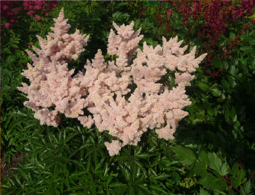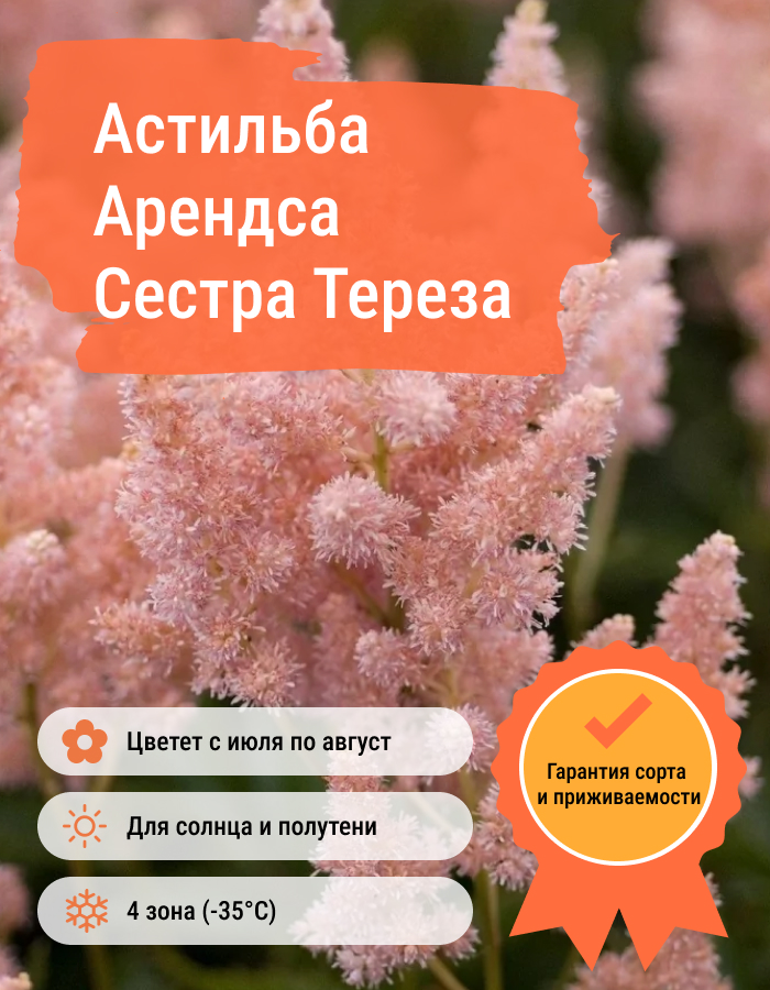 Рассада астильбы «Сестра Тереза» (Sister Theresa) имеет темно-зеленые листочки, которые потом приобретают светлый оттенок. Высота взрослого кустарника не больше 50 см. Зацветает рассада астильбы «Сестра Тереза» в июле. Цветение сопровождается раскрытием высоких и пышных соцветий, которые имеют легкий приятный аромат. В это время кустик окрашивается в нежно-сливочно-розовый цвет. Семена высевают на затененные участки. Если место хорошо освещенное, то необходим постоянный полив. К почве растение не требовательно. Достоинства сорта: устойчивость к морозам, болезням и вредителям.
