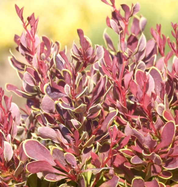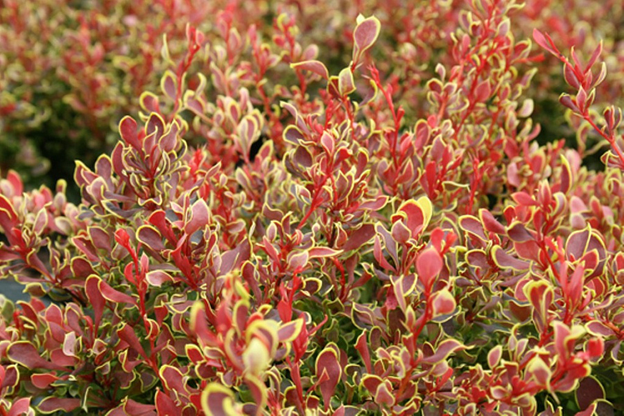 Саженцы Барбариса (берберис) Тунберга Голден Руби (Golden Ruby) привлекают садоводов скромными размерами, аккуратной плотной подушковидной кроны и интересной окраской листьев. В течение сезона кустарник изменяет свой цвет с нежно-арбикосового в начале лета на огненно-красный через месяц. В начале осени на мелких овальных листочках появляется желтая окантовка, добавляя многолетнику яркости.