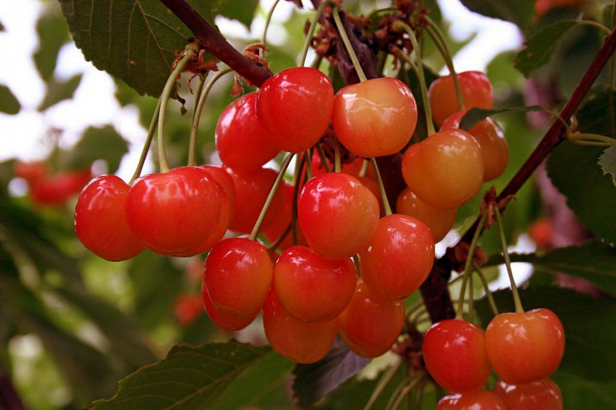 Саженцы черешни Фатеж интенсивно растут первый год, формируя пониклую раскидистую крону. Первые ягоды с сочной розовой мякотью появляются на 4 год укоренения саженца, всего до 5 кг плодов. К зрелости крупномер достигает урожайности до 45-50 кг. Размер ягод средний (4 - 6 г) и равномерной округлой формы. Кожица тонкая, с блеском, красновато-желтая, прочная и пригодная к транспортировке. Сок содержит большое количество аскорбиновой кислоты (29 мг/100 г). Особенности ухода: