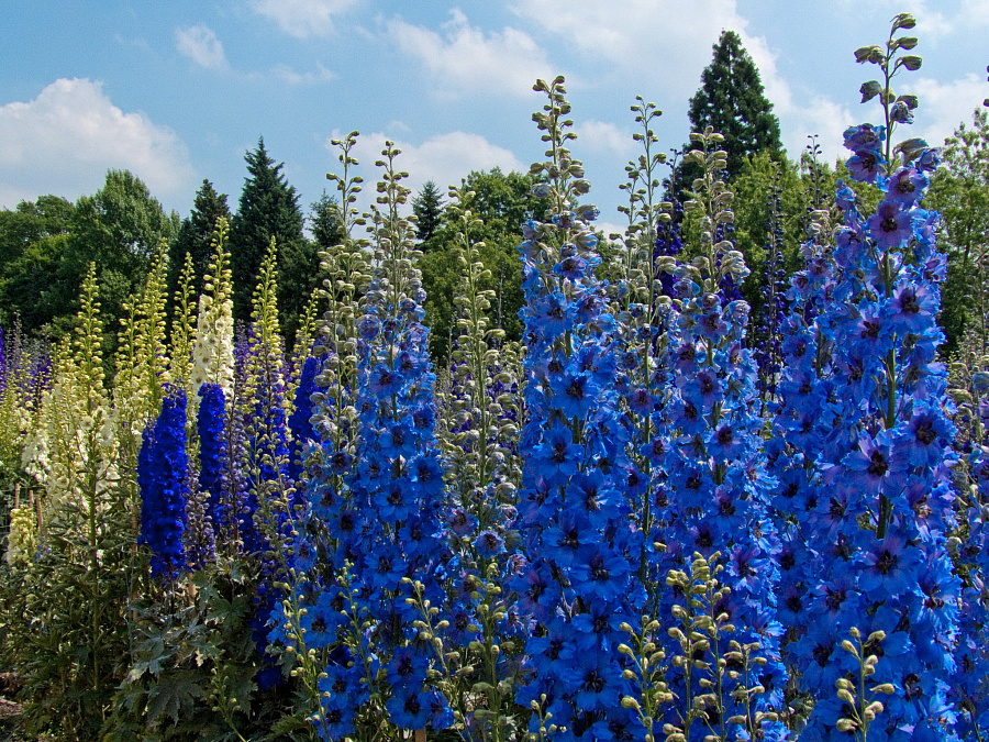 Рассада Дельфиниум высокий – многолетнее растение с синими и фиолетовыми цветками в соцветиях высотой 50 см. Цветение приходится на июль и длится около 25 дней. После завершения цветения декоративность растения теряется, поэтому лучше срезать увядшие кисти вместе с прикорневыми листьями. Спустя некоторое время после обрезки происходит формирование новых листьев, а также в начале сентября может произойти повторное цветение. Для ухода за культурой понадобиться осуществлять полив и разрыхление почвы, а также срезание старых побегов, подвязку кустов. Чтобы получить мощные цветоносы с выраженными соцветиями побеги рекомендуется прореживать перед наступлением зимы.