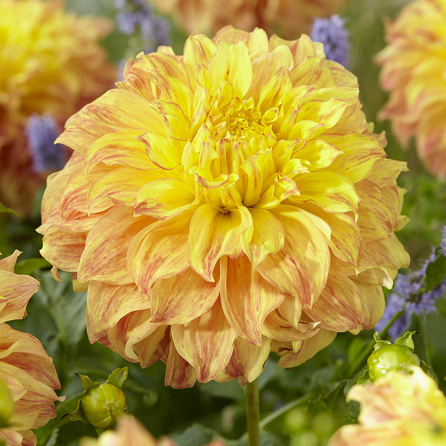 Георгина декоративная эль соль - это великолепное растение с яркими цветами, которые будут радовать вас с июня по сентябрь. Ее цветки имеют насыщенно-желтый центр и лососево-оранжевую основу с красными мазками на краях, создавая удивительный эффект "меланжа". Растение достигает высоты до 110 см, с крупными цветками диаметром до 25 см. Георгина el sol предпочитает солнечные места и дренированные богатые почвы. Она идеально подойдет для газонов, групповых и одиночных посадок, а также для миксбордеров. Это многолетнее растение зимостойкое в московской области и большей части России (зона 4). Для ухода рекомендуется регулярный полив и удобрения. Георгина el sol не требует особого внимания к болезням и вредителям, что делает ее отличным выбором для садоводов всех уровней. Приобретите эту георгину и добавьте яркие краски в свой сад!