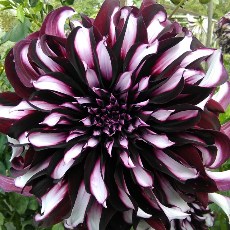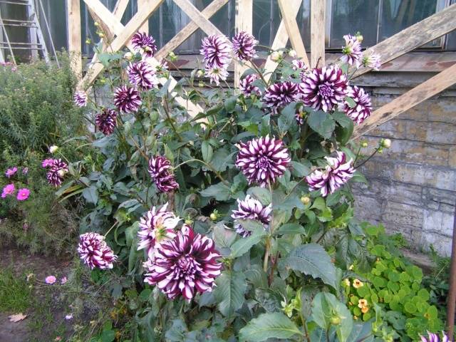 Луковицы георгины Декоративной Тартан (Tartan) любимы у садоводов за яркость, пышность цветения и внушительные размеры. Огромные соцветия бело-фиолетовой расцветки возвышаются на высоте 130 сантиметров над землей, что делает сорт одним из самых высоких. Растения заслуживают того, чтобы быть высаженными в парадной зоне участка для привлечения внимания к определенной зоне.