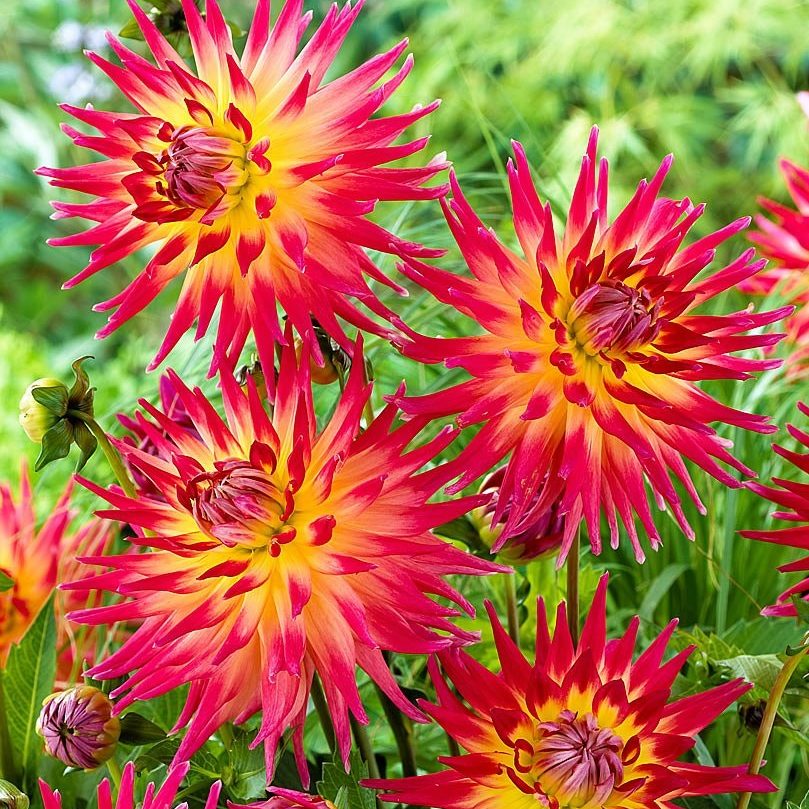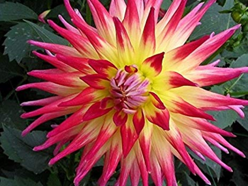 Луковицы Георгины Полукактусовой Электрик Флеш (Dahlia Electric Flash) – идеальный выбор для оформления сада. Этот сорт имеет мега-огромные цветы – до 20 сантиметров в диаметре! И это при средних размерах куста до 80 сантиметров. Яркая и красивая окраска – желтый центр и насыщено-малиновые края лепестков – добавляют Георгине особого шарма и неповторимости. Многолетник сильно ветвится, имеет множество перистых листьев, а цветы представляют собой соцветия-корзинки полумахровые и немахровые. Обилие лепестков, свернутых в трубочки, расходится во всех направлениях от центра. Растение предпочитает солнечные, удобренные места и регулярный полив. На зимний период луковицы извлекают из почвы на хранение.