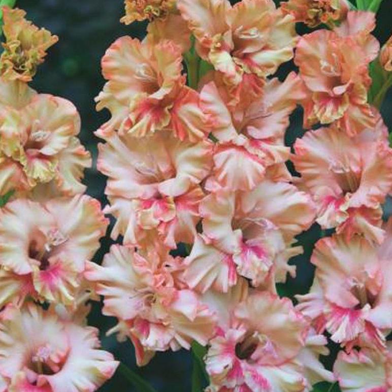 Луковицы гладиолуса гибридного Криспи Раффл (Crispy Ruffle) при правильном уходе вырастут в красивое растение из семейства ирисовых с нежнейшей окраской бутонов. Сорт относится к гофрированным разновидностям. Имеет высокий (около 110 сантиметров) стебель, который устремлен ввысь, прямо к небу. Любит солнечные места и легкие почвы (предпочтительнее супесчаные). Цветки пышные, крупные, основной цвет белый с желтой или оранжевой окантовкой. Одновременно дает до 20 бутонов. Гладиолус украсит любой участок и идеально подойдет для разных букетов. Цветет с июля до сентября.