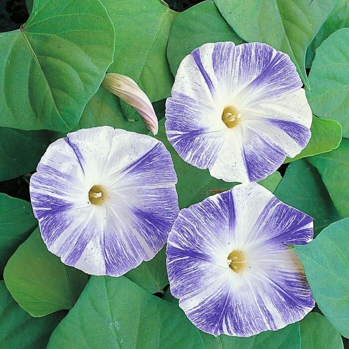 Семена ипомеи "Флаинг Соурсес" проращивают рассадным или безрассадным способом. В первом случае посев осуществляют в апреле. Рассаду пересаживают на постоянное место в конце мая — начале июня вместе с земляным комом. Сразу в открытый грунт семена ипомеи "Флаинг Соурсес" высевают в июне. Однолетняя травянистая лиана, длина стелющихся побегов составляет 2,5 метра, листовые пластины растут в форме сердца. Соцветия крупные, воронковидные, их диаметр порой может достигать 13-15 см, основной оттенок цветков белый, но на нем присутствуют лиловые и голубые полосы. Растение зацветает в середине июля и продолжает формировать соцветия до начала заморозков. Применяют культуру для вертикального озеленения участка и балконов. В уходе нуждается в регулярном поливе во время сильной засухи.