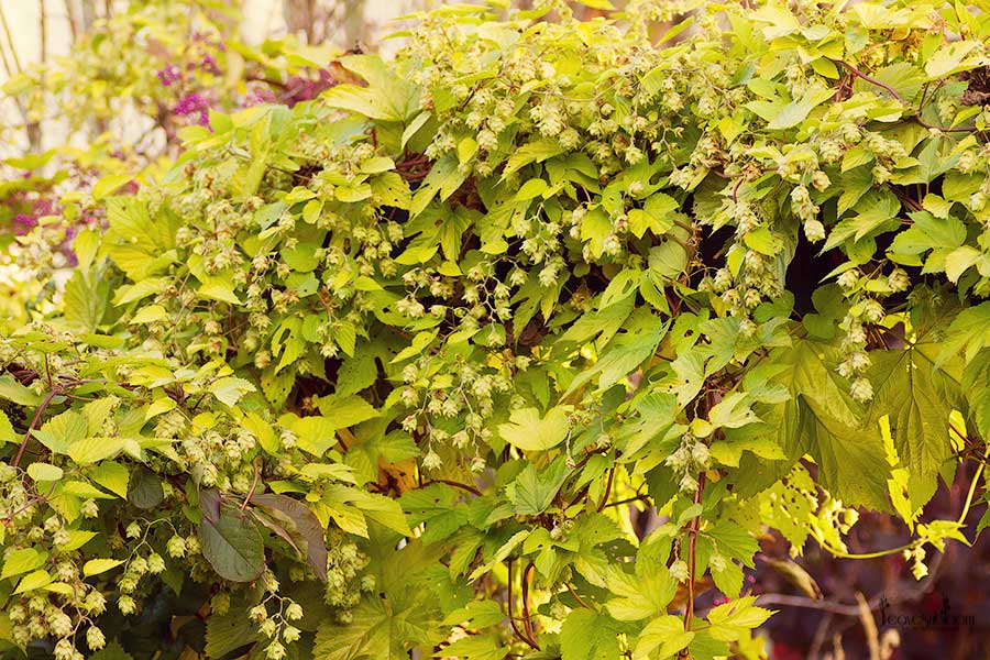 Humulus lupulus Aureus (Ауреус) - сильно-растущий многолетник с шероховатыми, вьющимися побегами. Дорастает в течение года до 6 м высотой, а растение может разрастаться до ширины 2-3 м, образуя в течение нескольких недель золотистую волну побегов и листьев. Надземные побеги хмеля отмирают каждую осень, а весной вырастают новые из подземной части растения. Листья крупные, глубоко-лопастные (как у винограда) зубчатые, шершавые, желтые весь вегетативный сезон. Хмель является двуполым растением, а сорт Aurea женский клон, поэтому осенью покрывается желтыми шишками.