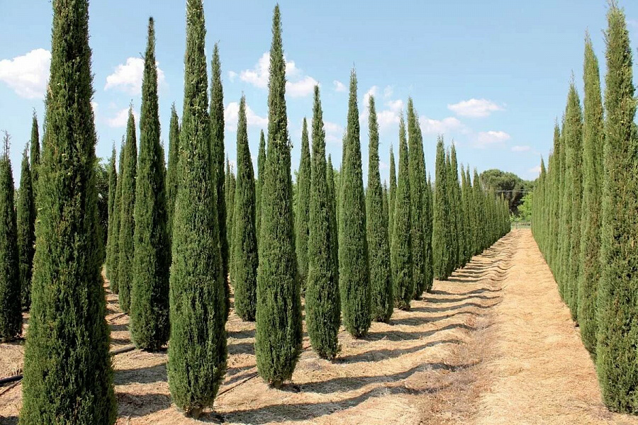Саженцы кипариса пирамидального позволяют вырастить вечнозеленые растения высотой до 6 метров. Это хвойное деревце обладает устойчивостью к холоду и порадует неприхотливостью к условиям произрастания. Этот сорт используют для создания живых изгородей, комбинированных композиций и одиночных посадок.