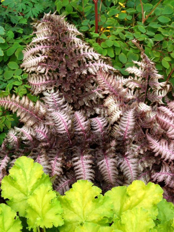 Саженцы Кочедыжника ниппонского Бургунди Лэйс (Athyrium niponicum Burgundy Lace) приобрели большую популярность за очень декоративную листву, имеющую металлический блеск и красно-багряные оттенки стебля. Кочедыжник ― это папоротник, сорт Бургунди Лэйс меняет свою окраску постепенно. Сначала появляются молодые красно-бордовые побеги, затем цвет листвы приобретает светло-розовый оттенок, а после она становится светло-серебристой с бордовой центральной частью. Сорт растет очень быстро при создании ему комфортных условий. Как и все папоротники тенелюбив, но немного солнца для проявления окраски получать все же должен. В притененных цветниках отлично смотрится с разными видами хост.