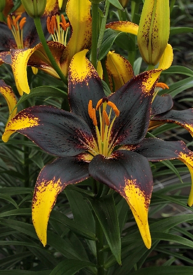 Окраска цветка : цветы золотисто-желтые, с многочисленными темными крапинками, сливающимися в широкую темно-лиловую сердцевину, классической звездчатой формы, широко-раскрытые, направлены вверх и в стороны