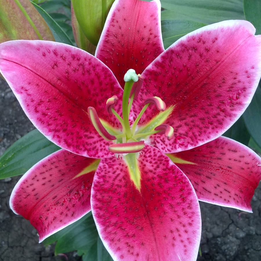 Окраска цветка : насыщенно-розовый с темным крапом, кончики белые