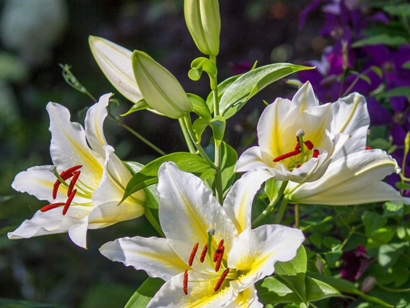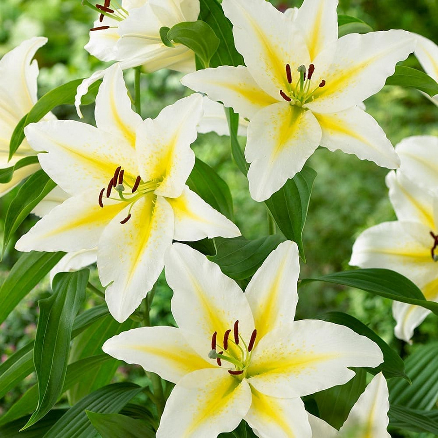 Луковицы лилии восточной Бафферари (Lilium oriental Bafferari) — очень изящный и нарядный сорт, подойдет любителям контрастов и насыщенных оттенков. Он популярен благодаря особенно крупным цветам (до 25 см в диаметре). Лепестки широкие, с ярко-желтым центром и белыми краями — между этими оттенками нет плавного перехода. Пыльники темно-бордовые, создают дополнительный контраст. При грамотном уходе лилии могут расти в открытом грунте до 5 лет без пересадки. Взрослое растение достигает 110–120 см, отличается мощным стеблем и высокой устойчивостью к перепадам температур и вредителям. Если на зиму срезать стебли и накрыть луковицы, за них можно не переживать даже при заморозках до –35 градусов.