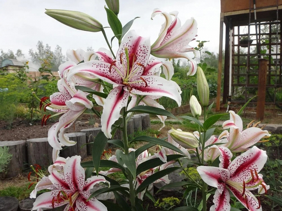 Луковицы лилии восточной Солюшн (Lilium hybrid oriental Solution) принадлежат к очень нарядному сорту с крупными ароматными цветами. Многолетник эффектно смотрится в групповых и смешанных посадках, в букетах. Цветки крупные, в диаметре достигают 20-22 см. Раскрытые бутоны отличаются белоснежным фоном, на котором выигрышно смотрятся желтая звезда, расположенная в центре, ярко-малиновый крап и мазки. Высаживать лилию восточную Солюшн следует в сухую, рыхлую, питательную, водопроницаемую почву на хорошо освещенные, защищенные от ветров места.