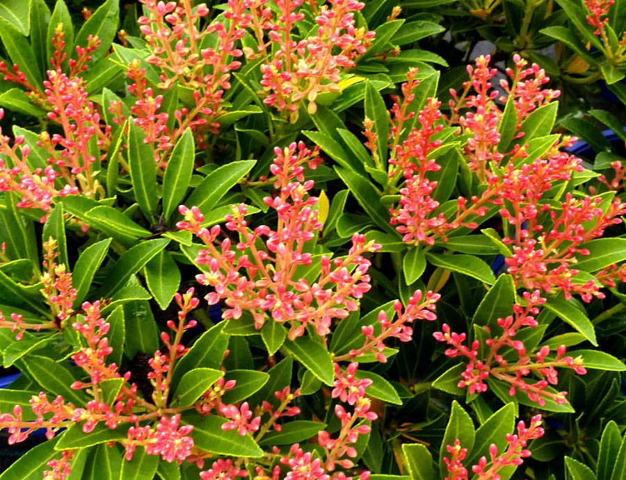 Глянцевые листики красиво отражают цвет. В сезон кустарник покрывается белоснежными цветами, и украшают сад до конца апреля. Затем на ветках появляются тёмные ягоды. Этот вид пиериса имеет плоские корни, которые располагаются близко к поверхности. Чтобы кустарник хорошо перенёс зиму, следуют мульчировать землю листвой.