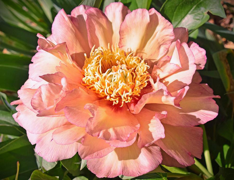Саженцы пиона ИТО Berry Garcia (Берри Гарсия) Цветок от двойного до полумахрового с желтыми тычинками, которые выделяются, смесь еще невиданных цветов кремово-розового и абрикосово-розовыми лепестками и темно-розовых вспышек. Бутоны сорта распускаются постепенно: сначала верхушечные, а затем боковые. Благодаря этому взрослые кусты отличаются продолжительным цветением. Саженцы пиона ИТО образуют привлекательные плотные, аккуратные округлые кусты с крепкими стеблями и узкими, темно-зелёной листвой, которая остается зеленой до осени. ИТО-пионы - это уникальные сорта, полученные путем скрещивания травянистых и древовидных пионов. Им присущи лучшие качества обеих групп: многолетники выносливы и устойчивы к жаре и влажности. Характерные особенности растения: