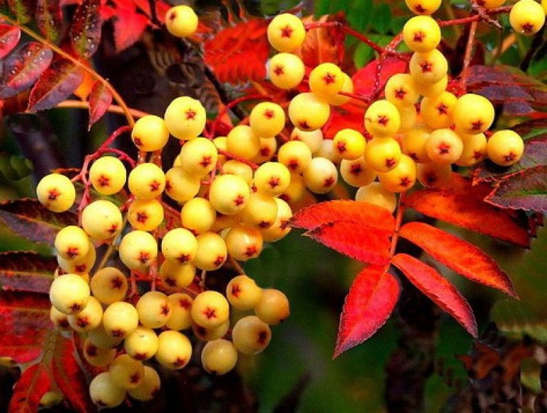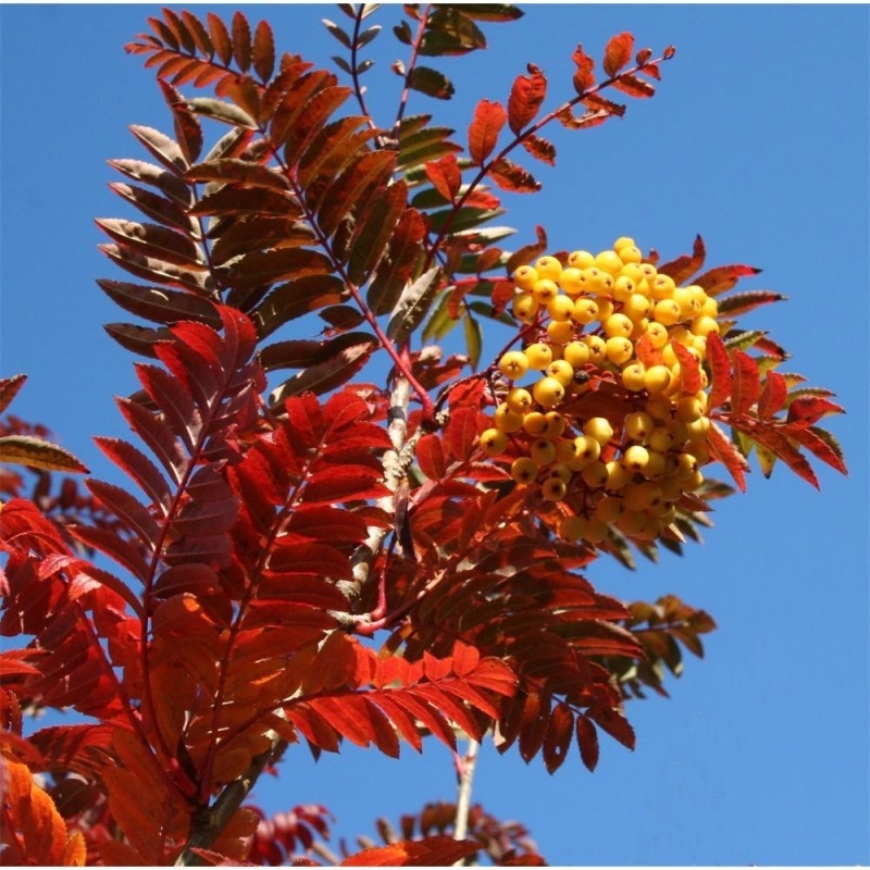 Саженцы Рябины невежинская Жёлтая – это не только красивый сорт, но ещё и полезный. Ведь плоды съедобны и вкусные. Этот вид был выведен в России, а значит, хорошо чувствует себя в холодном климате. Дерево достаточно высокое – 10 метров. Тонкие веточки создают изящную крону. За счёт этого можно высадить аллею из рябин, отступать следуют по 35 сантиметров между новыми саженцами Листочки крупные, как и у всех рябин имеют форму пера. После цветения завязываются ягоды, их можно собирать в сентябре и октябре. В отличие от других представителей у плодов нет привычной терпкости. Как привило, из ягод делают заготовки и сушат.