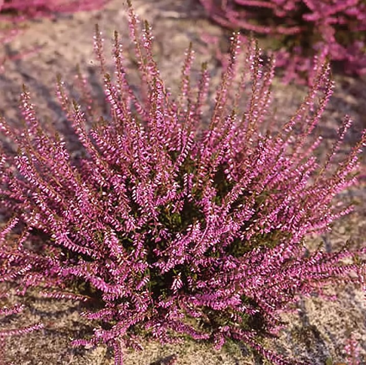 Саженцы Вереска обыкновенного Малин (Calluna vulgaris, Marleen) растут на солнечных участках альпинариев, миксбордеров, каменистых горок, рокариев. Многолетник эффектно смотрится в групповых и одиночных посадках. Высота взрослого куста не превышает 40 сантиметров. Цветы распускаются в конце лета и радуют своей красотой до первых осенних заморозков. Размер бутона не более 1 сантиметра. Розово-фиолетовые соцветия гармонируют с ярко-зеленой листвой. Вереск не привередлив к почвам, поскольку в естественных условиях растет на бедных песчаных грунтах. Переносит зимовку без укрытия.