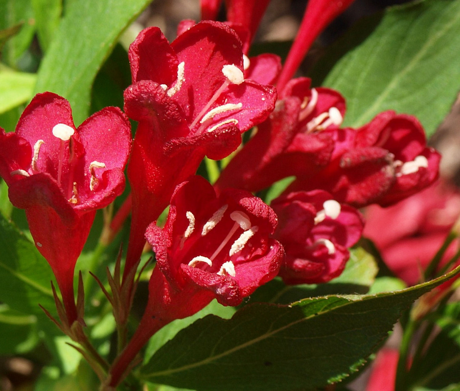 Саженцы Вейгелы гибридной Ева Ратке (Eva Rathke, Weigela hybrida) – морозостойкий декоративный кустарник семейства Жимолостные станет прекрасным украшением придомового участка или парка. Подходит для оформления миксбордеров и одиночной посадки, выделяя пышно цветущей кроной. Побеги вейгелы Евы Ратке достигают 150 см в высоту. Под тяжестью красных крупных цветков они сгибают к земле, формируя шар диаметром до 3 м. Расцветка цветков неравномерна: внешняя часть более красная, внутренняя – со светлым подтоном. Аромат приятный. Листья зеленые, продолговато-эллиптические. Кустарник высаживают на дренированных и хорошо освещенных участках.