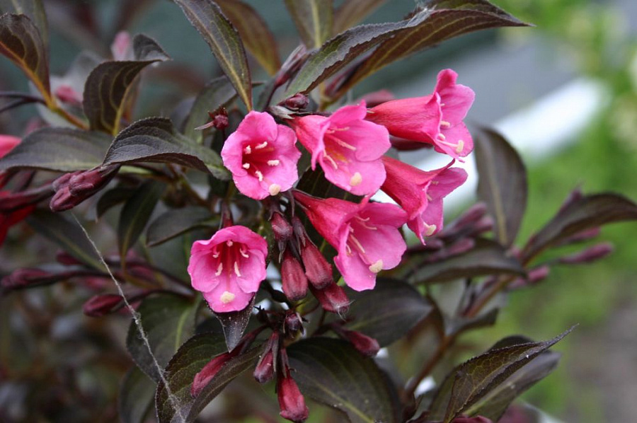 Саженцы вейгелы цветущей Victoria (Виктория) дают куст высотой 1,5 м. Листья удлиненные, меняют в течении лета цвет от темно-бордового до зеленого. Соцветия из 3-4 колокольчиковидных цветов красной или розовой окраски.