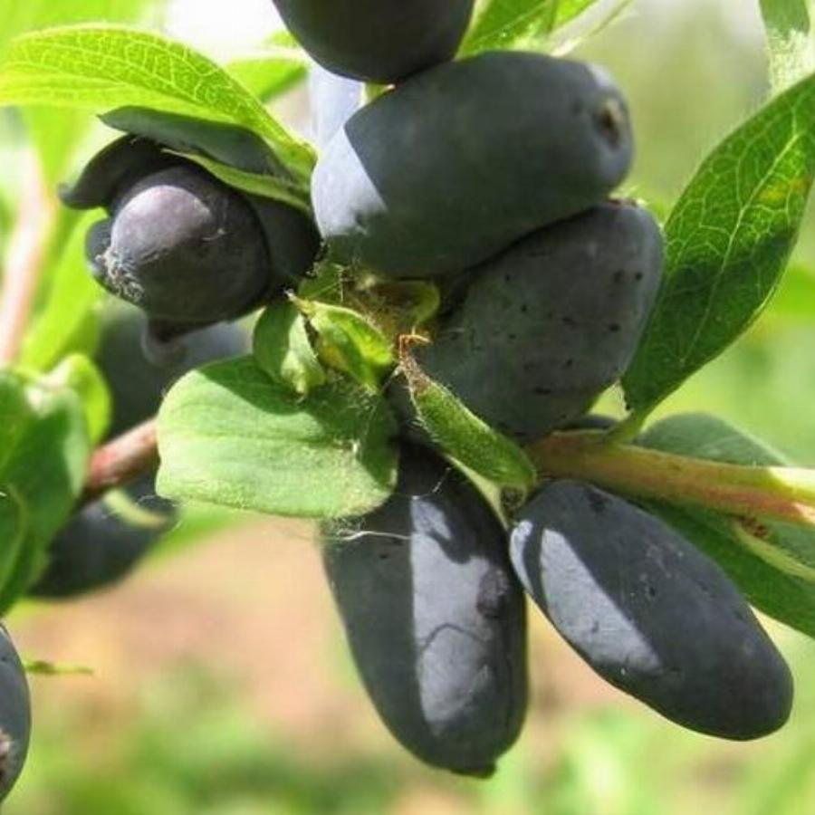 Саженцы жимолости съедобной Успех вырастают до полутора метров. Этот сорт отличается поздним сроком созревания ягод. Плоды у крупномера необычные – вытянутые, почти черные, с темно-серым налетом. Вкус гармоничный, присутствует легкая горчинка. Даже полностью созревшие плоды не осыпаются с куста. Крупномер декоративный, слабораскидистый. Побеги незначительно изогнуты. Листья малахитовые, небольшого размера. Уход за этим растением несложен: